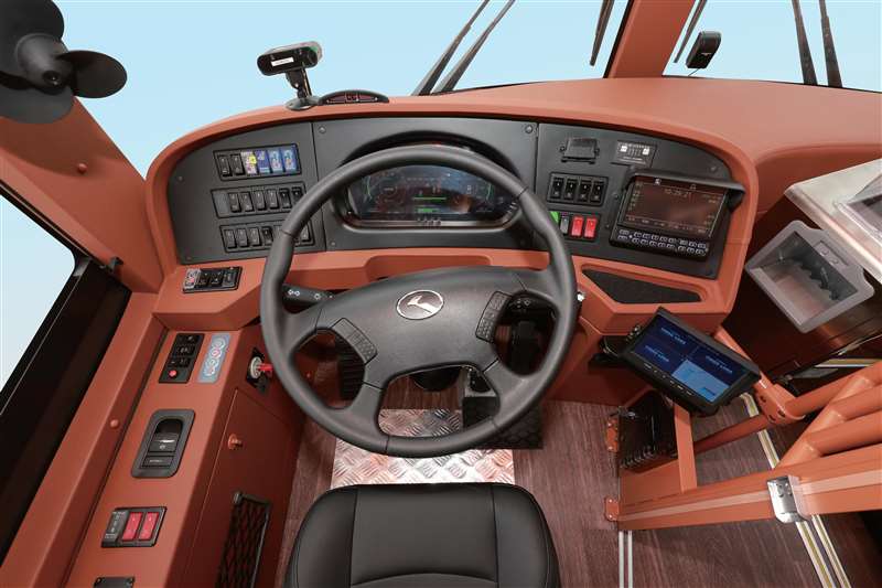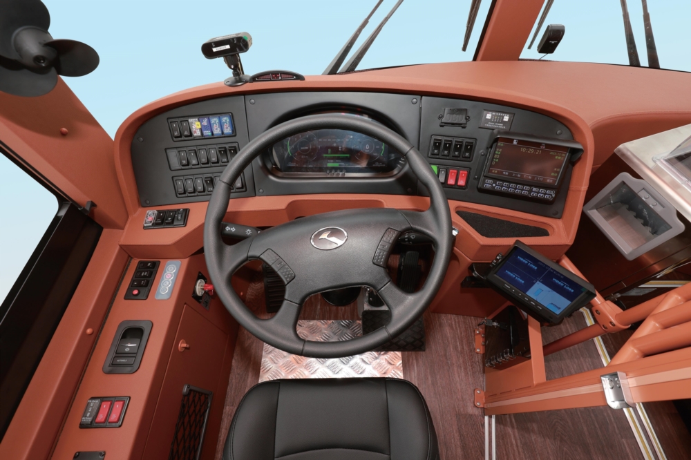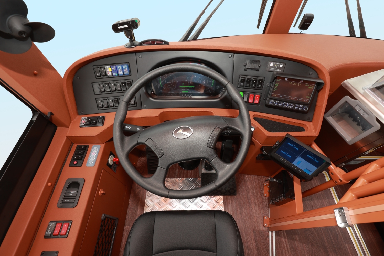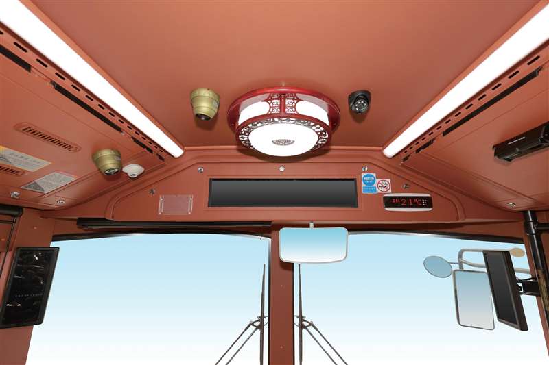 金龍純電動鐺鐺車駕駛艙將復古美感與現代科技的結合展現得淋漓盡致。鏤空屏風包圍而成的獨立駕 駛區,為司機營造不受干擾的自主駕控空間。液晶顯示屏及真皮減震座椅等現代化智能設備鑲嵌于復 古風格之中,智捷駕駛的同時喚醒時代記憶,再次馭見經典。