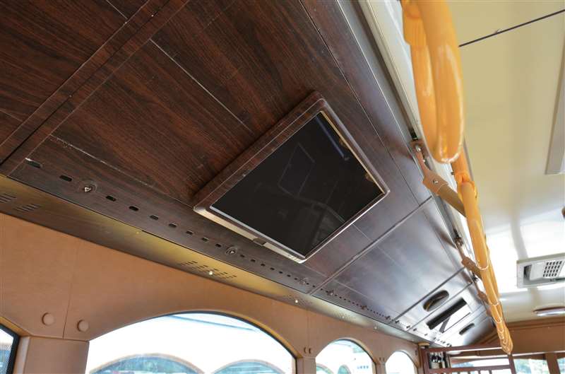金龍純電動鐺鐺車不僅外表承襲經典,其內部也無限接軌未來。復古的車廂內部有別于傳統公交的設 計風格,古韻燈具、屏風和木紋地板更為車廂平添了一絲儒雅氣息。LED 超大顯示屏、360 度全方位 視頻監控及車載空氣凈化器等現代化配備,造就復古與現代的完美結合,精致由內而外。