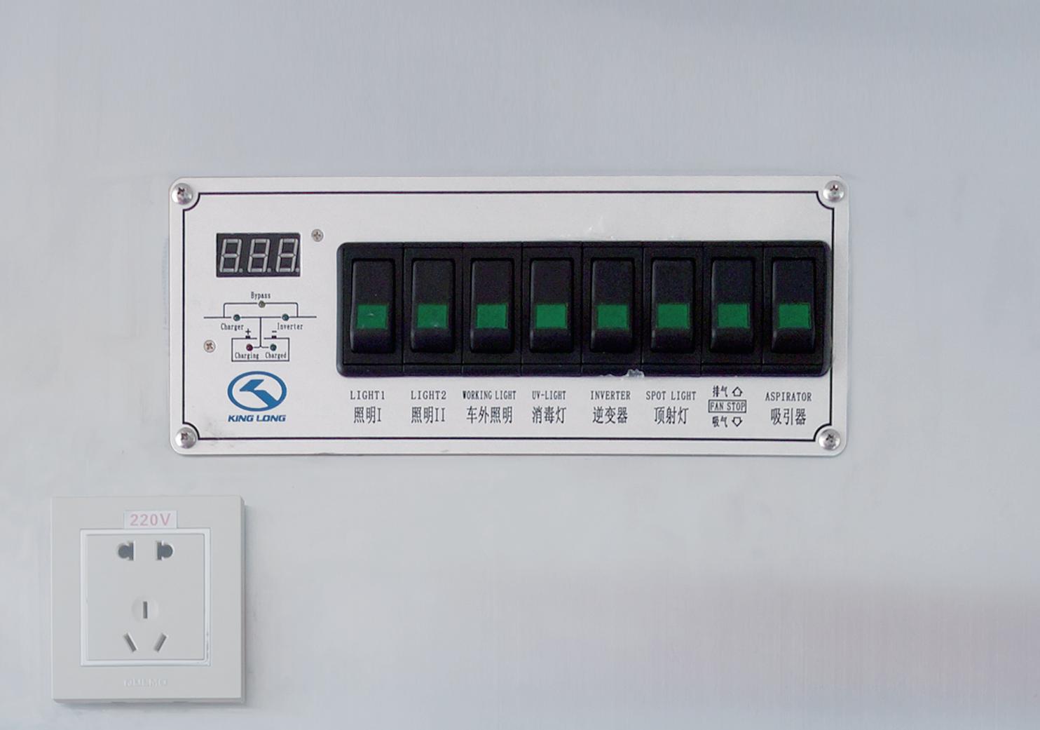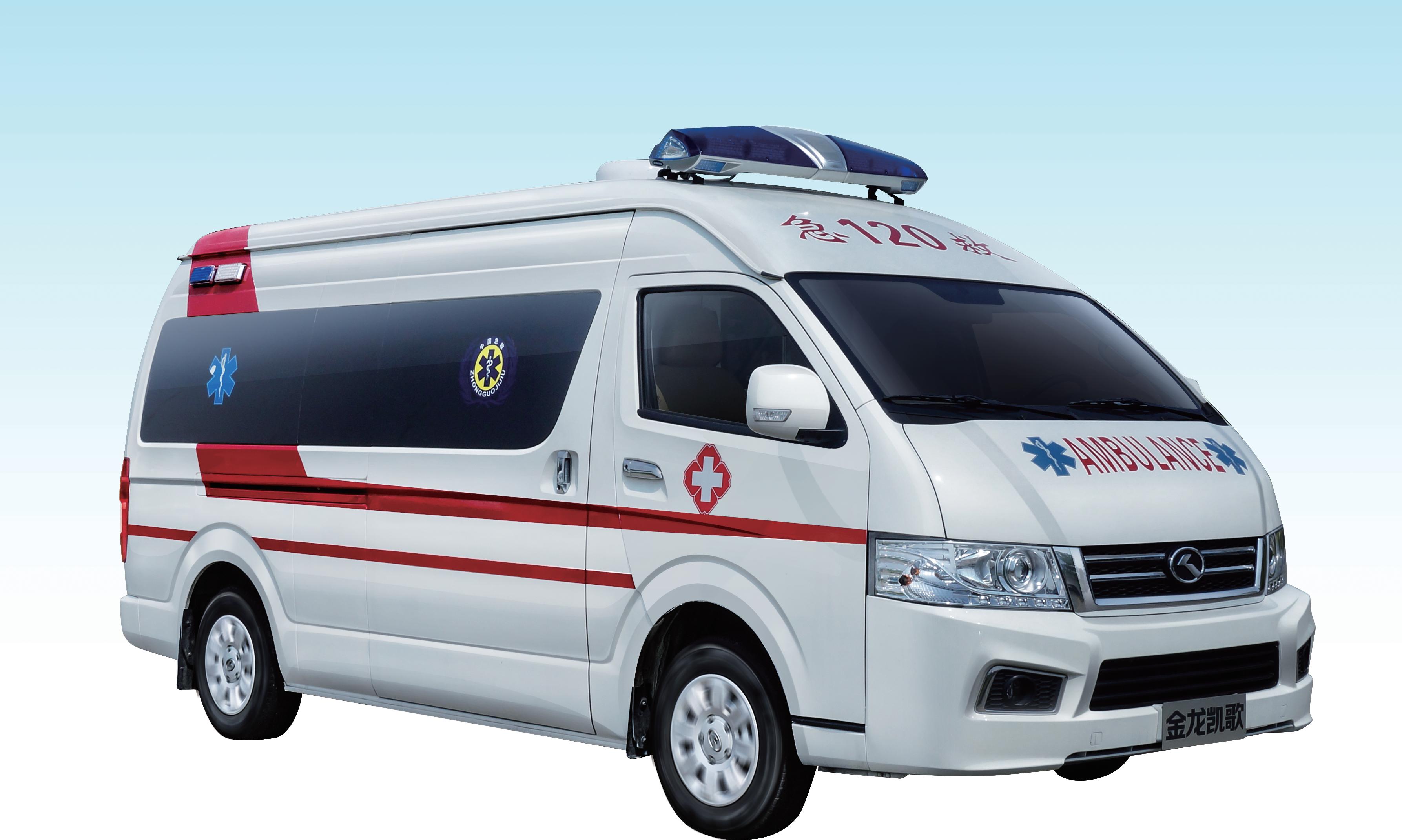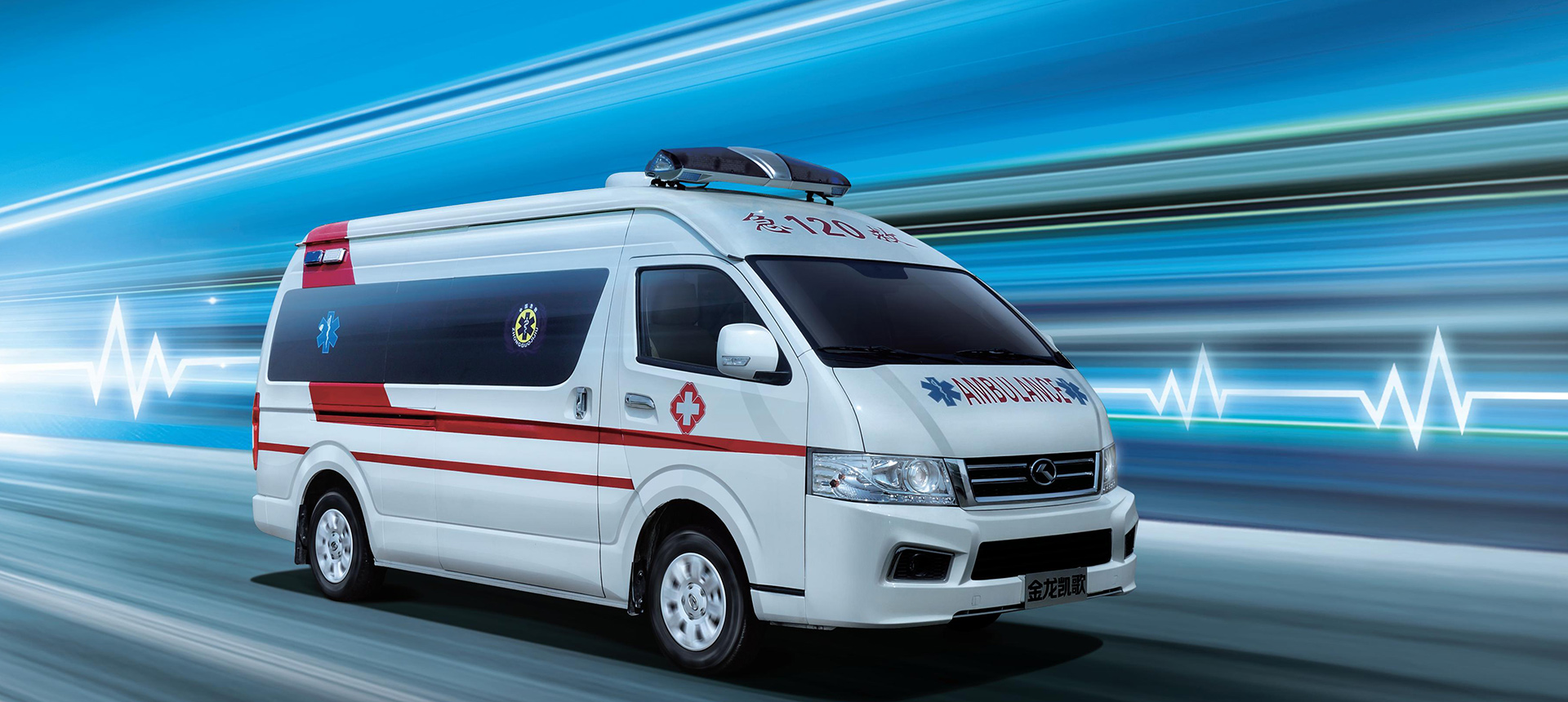 金龍凱歌監護型救護車車頂LED藍色半圓弧形長排警燈、尾部爆閃警燈和場外照明燈