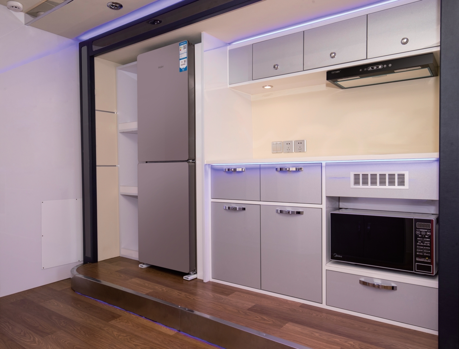 廚房內嵌190L房車冰箱,冷藏冷凍均可,旁邊壁柜儲物空間豐富實用。