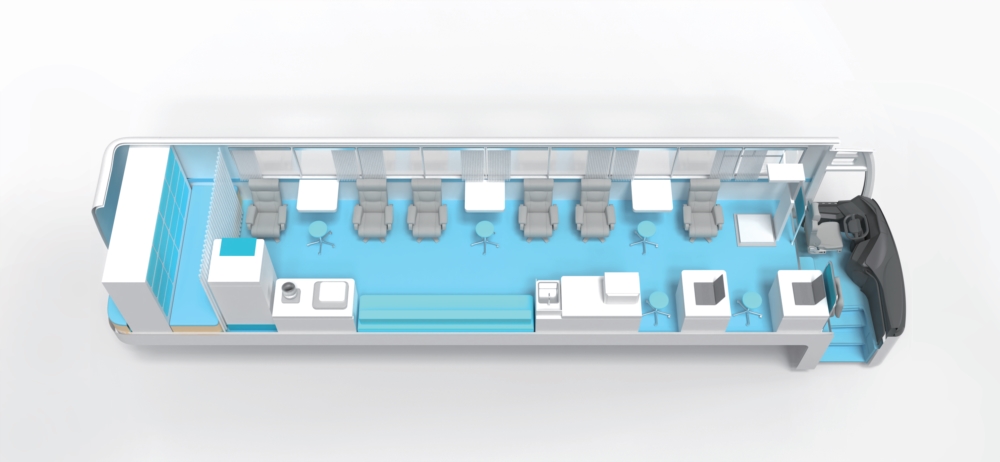 12米大巴客車平臺,車內空間寬敞,搭載市電空調,配備3個采血位和6個采血椅,配有微波爐、食品冰箱、飲水機等生活設施,設有應急休息床,可最大限度保障獻血者的舒適度和人身安全。此外還可裝配拓展倉,拓寬車內采血空間。