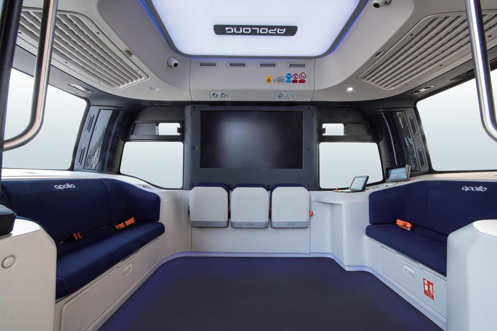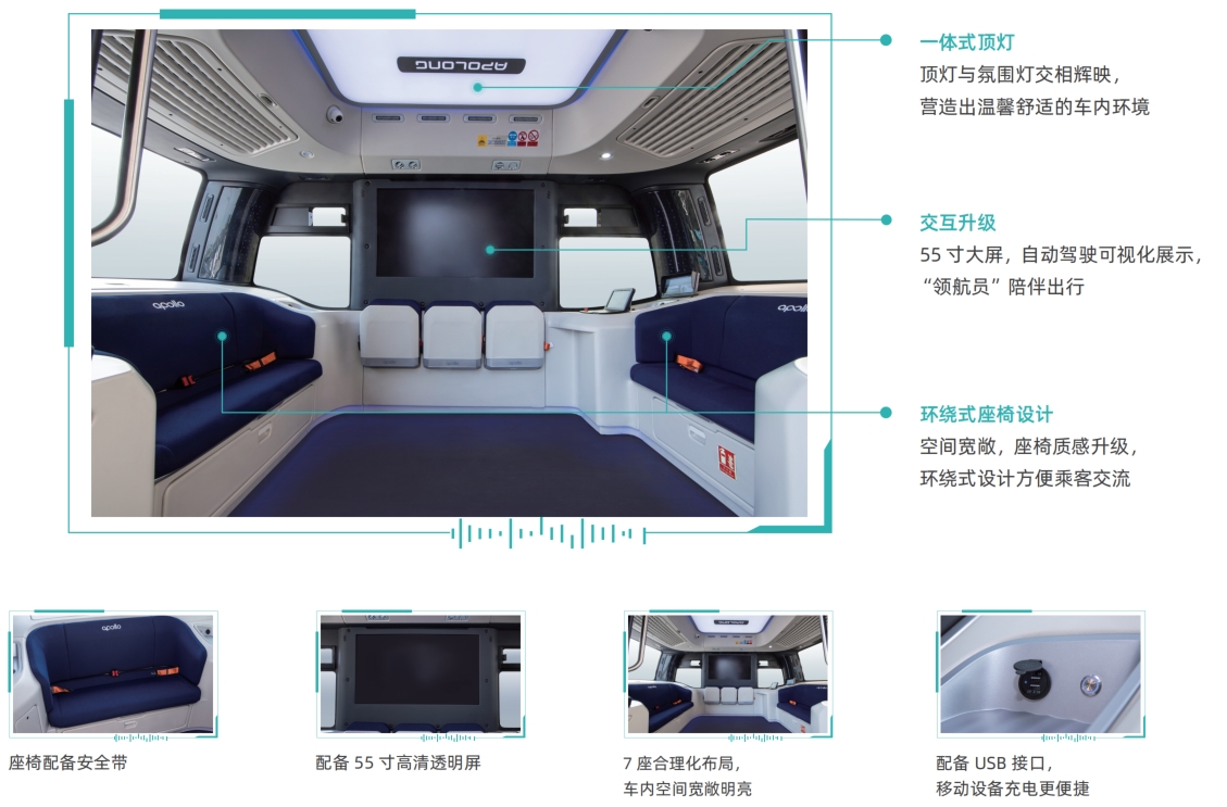 智能座艙提供豐富的人車交互體驗,乘客可在任意站點乘坐阿波龍 II 自動駕駛小巴, 通過高清屏幕、領航員語音交互,可實時了解周圍路況、車輛駕駛狀態和周邊吃喝玩 樂信息,提供沉浸式自動駕駛體驗和一站式服務體驗。