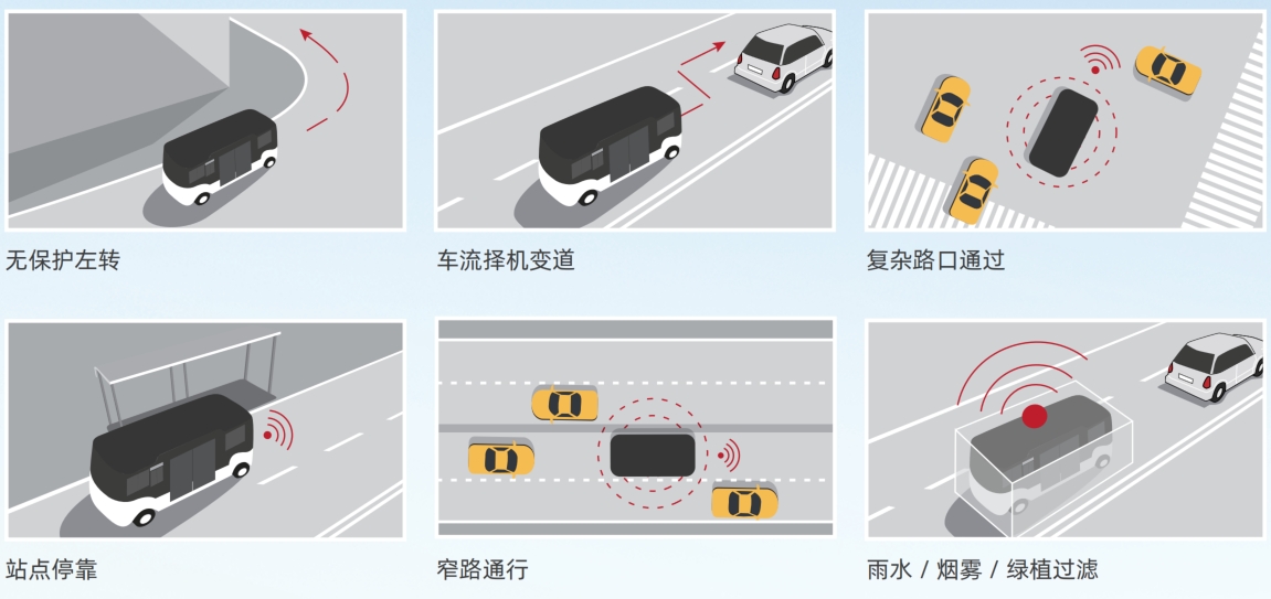 阿波龍 Ⅱ 融合了百度自動駕駛系統和金龍深厚的造車經驗,集成最新一代駕駛計算平臺及傳感器方案,搭載激光雷達系統,視覺系統,毫米波雷達系統等傳感器,實現感知區域的 360 度覆蓋以及傳感器、算法、計算硬件的安全冗余備份。探測范圍達 240m,定位精度達到厘米級,完全不懼怕高樓、隧道等各種弱 GPS 環境;計算平臺,從處理環境感知信息、預測障礙物行為到動作規劃和執行,整體響應水平可達到毫秒級;比上一代車型新增信號燈識別能力,具備開放道路行駛的能力,具備 5G 無人駕駛能力,具備雨、雪、霧及高寒天氣行駛能力。