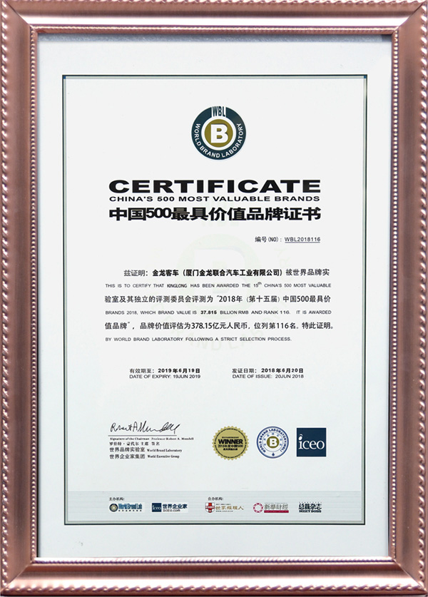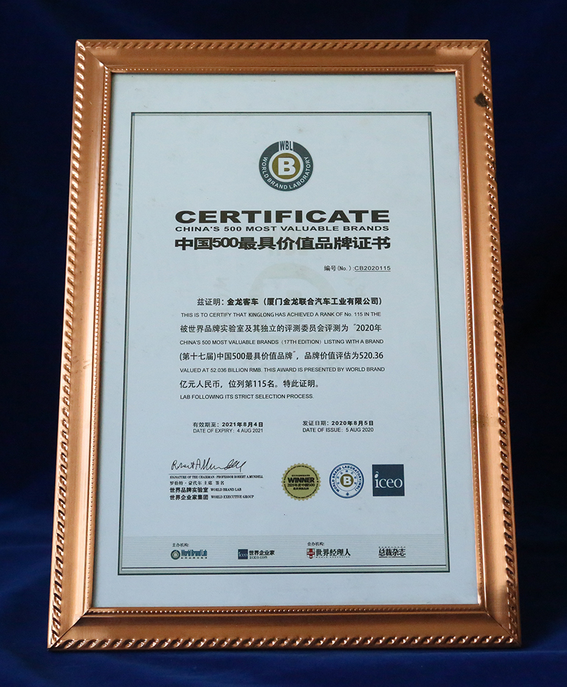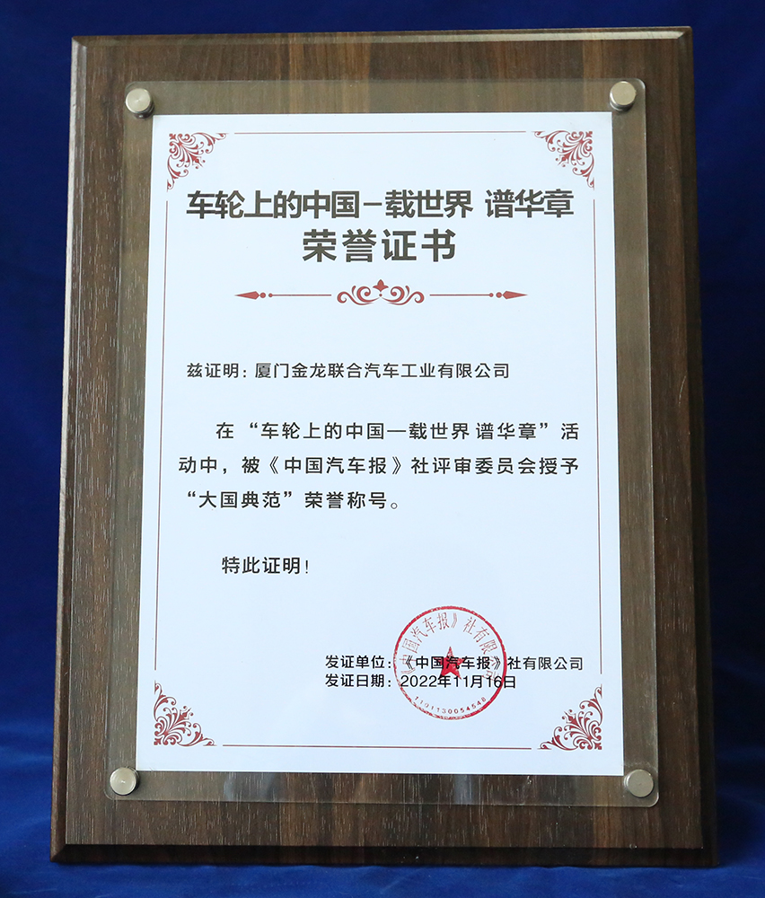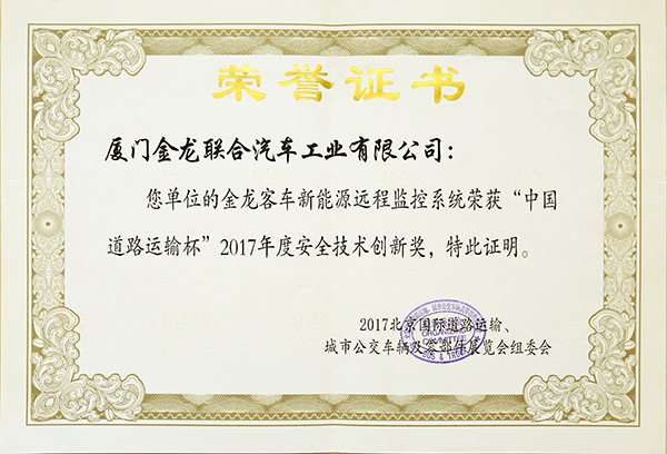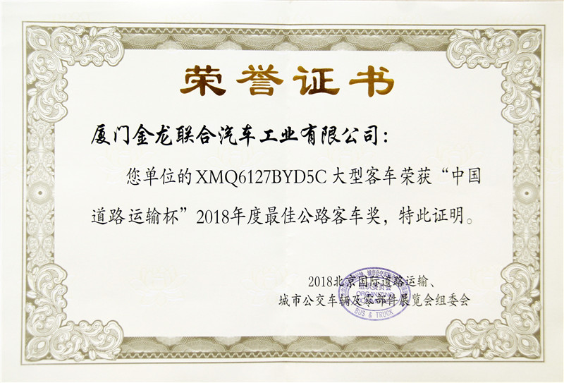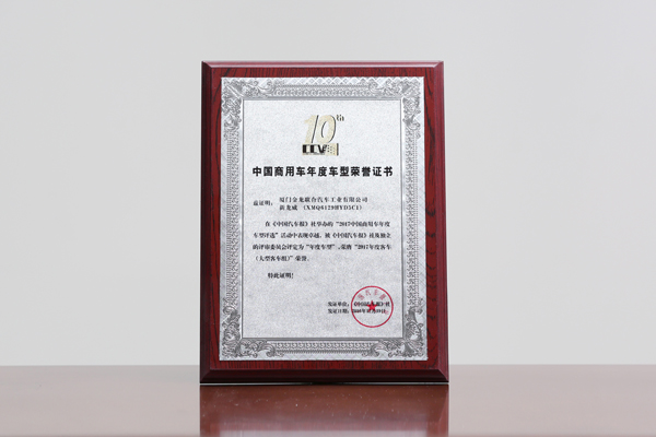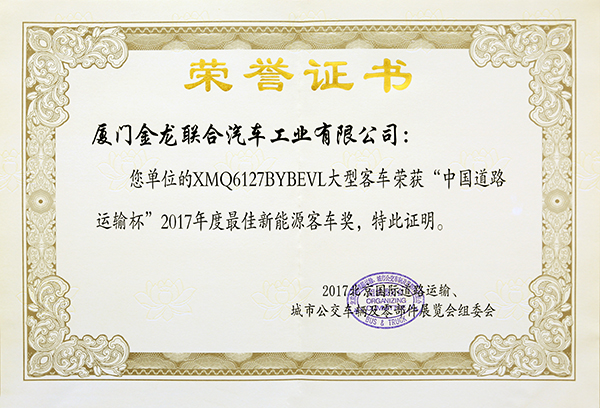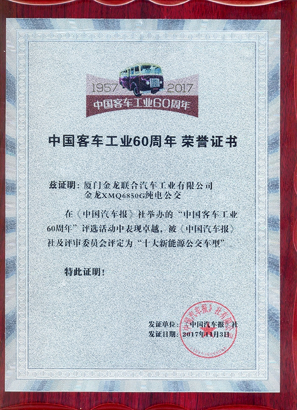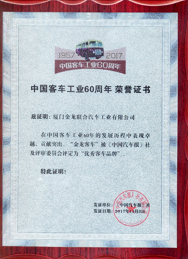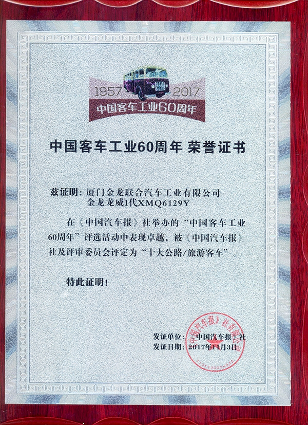 2017-中國客車工業60周年榮譽證書-十大公路-旅游客車-XMQ6129Y