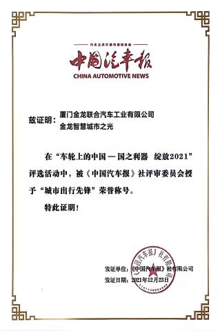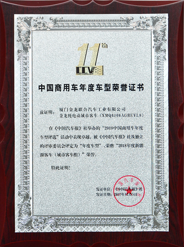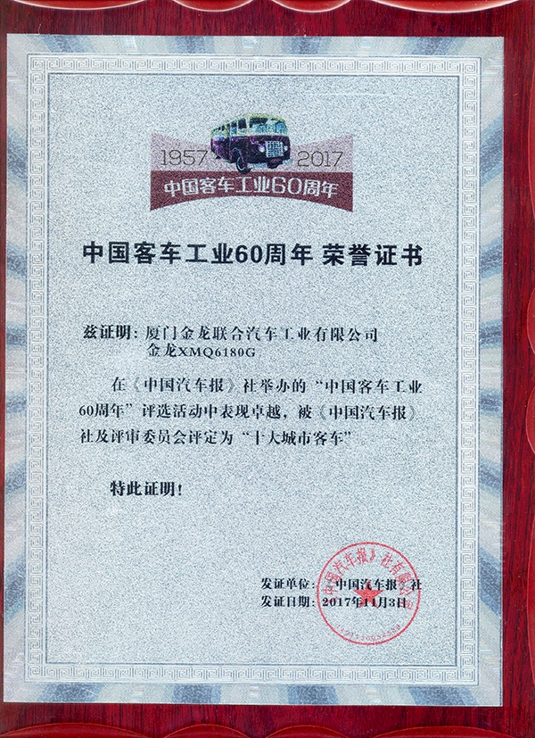 2017-中國客車工業60周年榮譽證書-十大城市客車-XMQ6180G