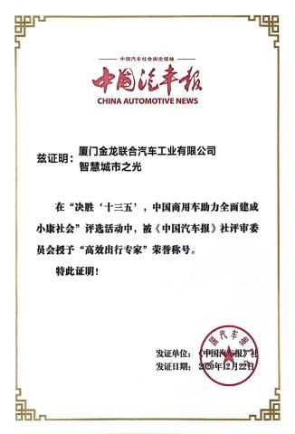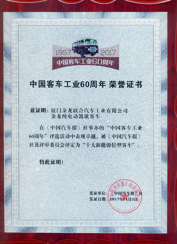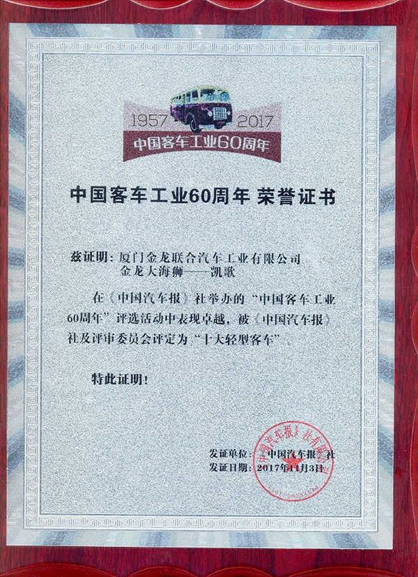 2017-中國客車工業60周年榮譽證書-十大輕型客車