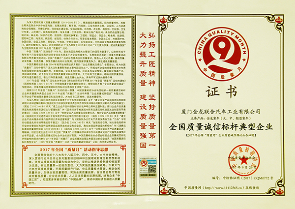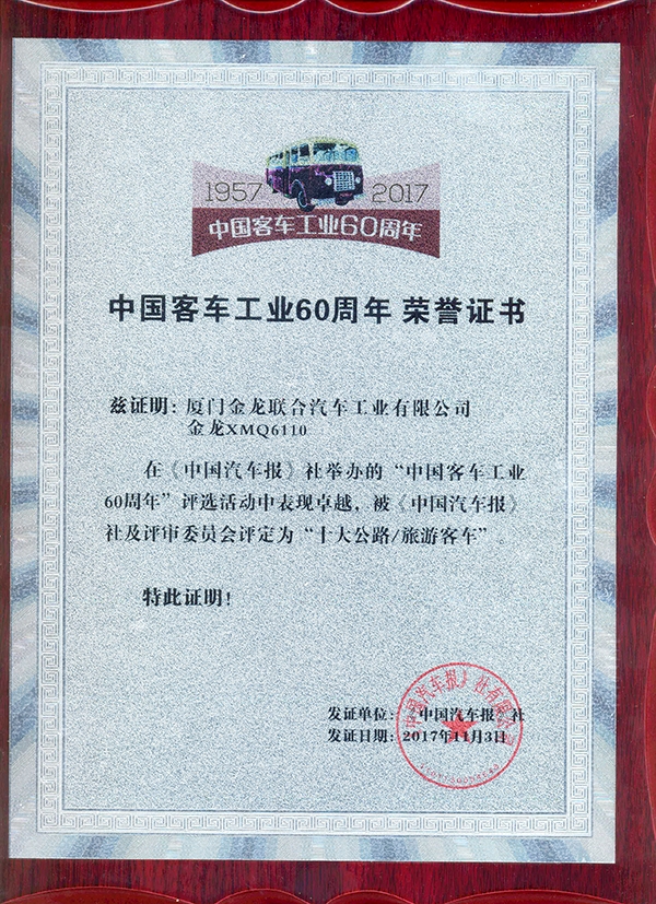 2017-中國客車工業60周年榮譽證書-十大公路-旅游客車-XMQ6110