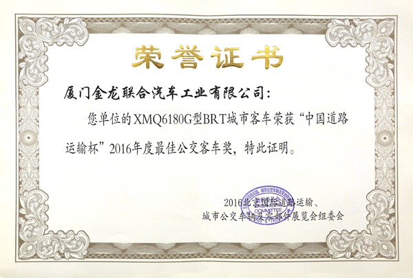 2016年度最佳公路客車獎(XMQ6180G型BRT城市客車)