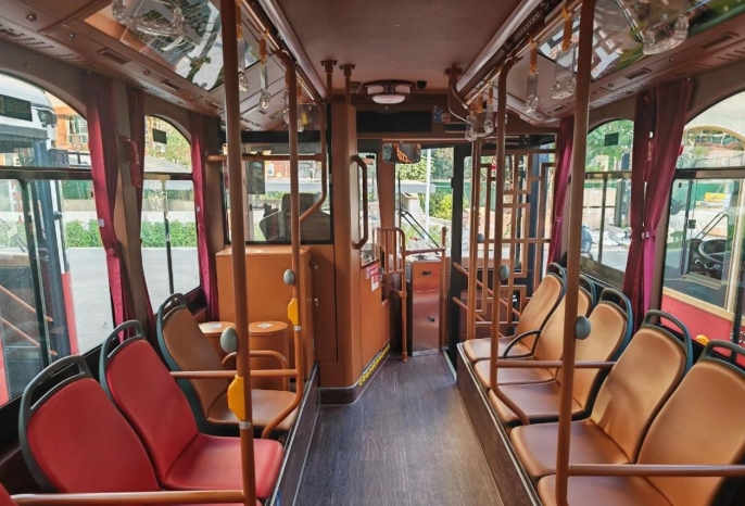 即將投運(yùn)的“鐺鐺車”均為金龍新能源純電動(dòng)公交車,節(jié)能環(huán)保,安全舒適。此款金龍純電“鐺鐺車”采用復(fù)古式、民國風(fēng)的內(nèi)外觀造型,進(jìn)入車廂就恍若穿越回上個(gè)世紀(jì),車內(nèi)寬敞明亮,暗色地板與棕紅的仿皮座椅相互襯托,內(nèi)飾扶手和拉環(huán)均采用仿古設(shè)計(jì),車廂尾部還有一處模擬民國時(shí)期鐺鐺車的駕駛臺(tái),讓游客進(jìn)行深度體驗(yàn)。