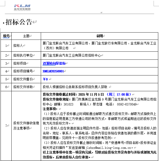 公開招標招標公告-金龍集團-雙源轉向泵項目